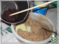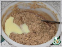 Смешать с какао и сгущенкой (может пойти эффект отслойки, ничего страшного, после добавления шоколада и вымешивания это пройдет). Сгущенку добавляем по 1 столовой ложке. |