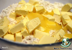 Сливочное масло нарезать кусочками, вместе с желтками добавить в муку.
