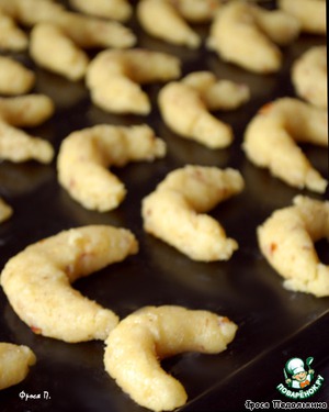 Из теста скатать небольшие колбаски толщиной с карандаш, длиной 5-7 см. Согнуть в виде подковки и выложить на смазанный противень.