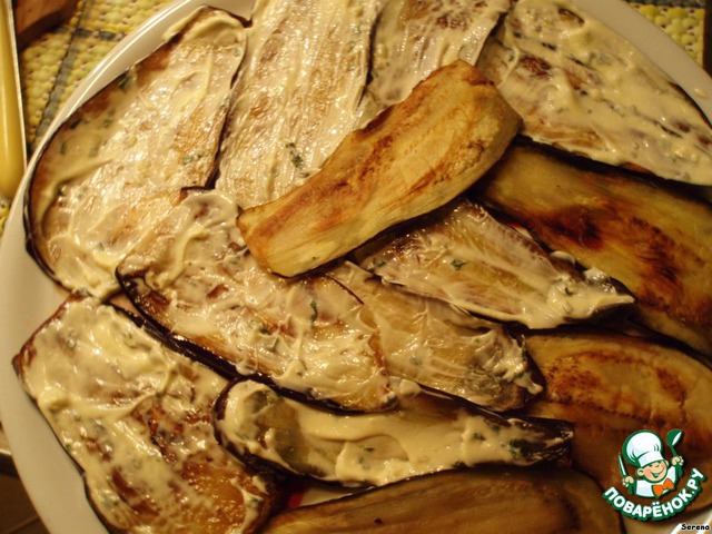 Выкладывая слоями баклажаны на широкую тарелку, намазываем каждый кусок сверху.