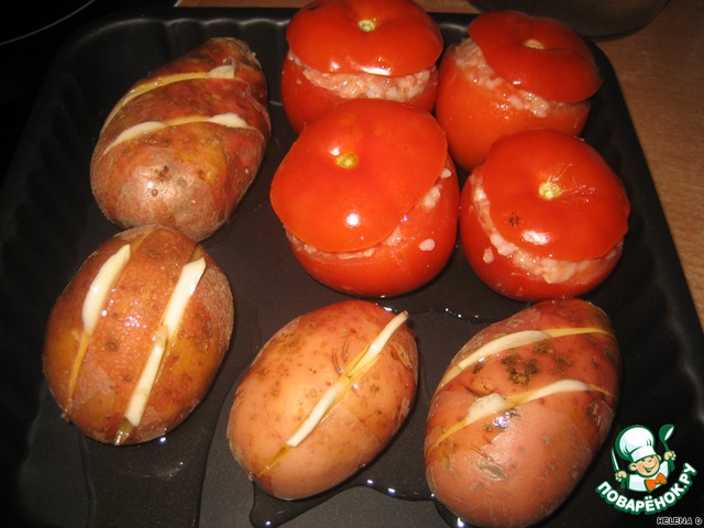 Поливаем растительным маслом и отправляем на противень к помидоркам - в духовочку до готовности...