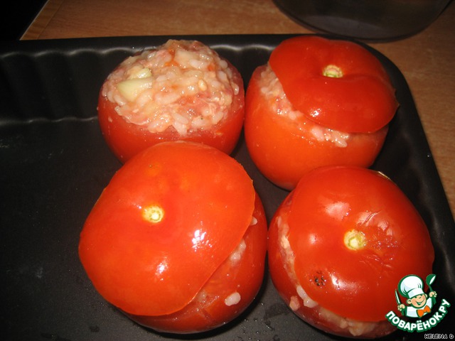 Был готовый фарш, я смешала с отварным рисом, зеленью и рубленным чесночком - нафаршировала помидорки.