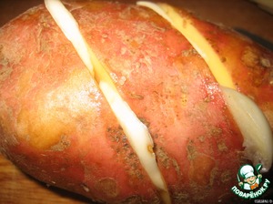 Чистый картофель надрезаем и вставляем в прорезь порезанные зубчики чеснока.