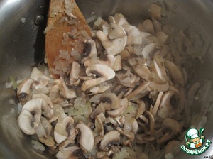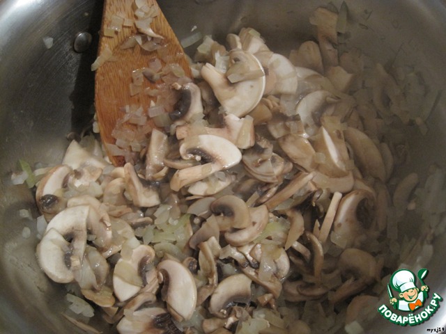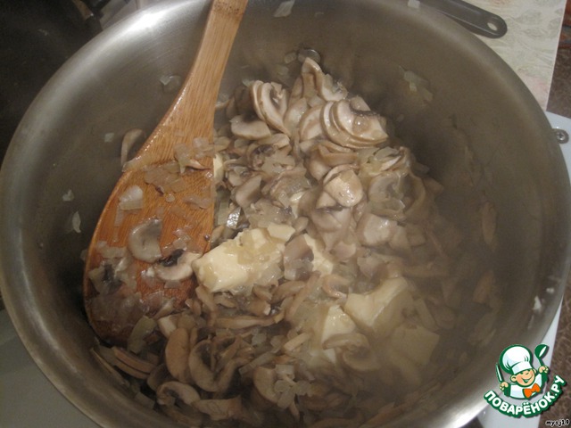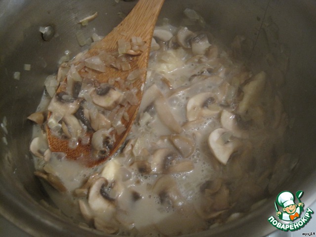 Супчик готовится быстро, в « горячем» режиме. Нарезаем лук, на 2х литровую кастрюлю берем пару луковиц, он как раз и даст нам наваристость. Кастрюля у меня 3х-слойная, поэтому все операции провожу в ней. Итак, лучок нарезан, отправляем в кастрюлю и слегка пассеруем. Пока готовится лук, нарезаем грибы. Шампиньон - экологически чистый гриб, пленку снимать с него нет никакой надобности, я мою их так: наливаю в кастрюлю холодную воду, развожу 1 ст. ложку муки и так мою, круговыми движениями. Потом остается только ополоснуть грибы чистой водой. Мука работает как абразив и прекрасно их очищает. Нарезанные грибы отправляем к луку и немного тушим.