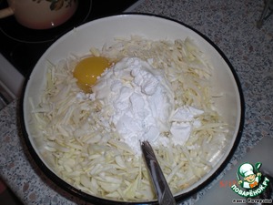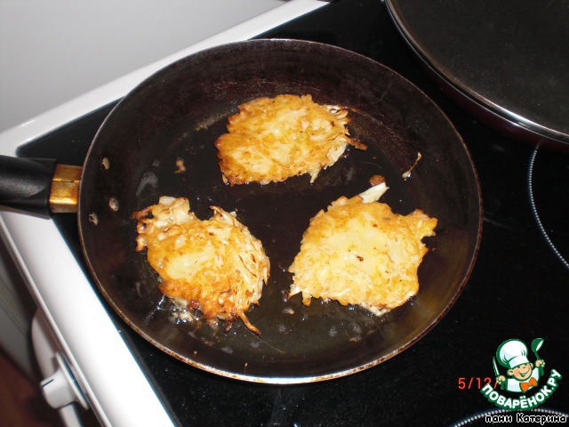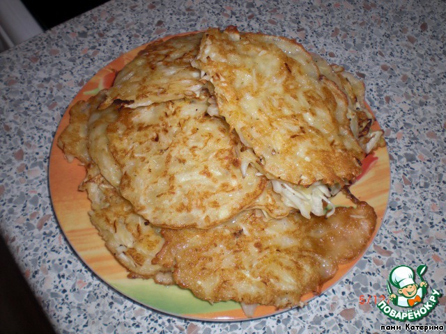 Хотелось драников, но было обнаружено только 2 картофелины, но зато рядом лежало полвилка капусты. В общем в магаз идти рано утром в субботу, да не позавтракав не хотелось и получились оладьи из того, что было.