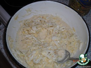 Добавить яйца, сметану (я думаю в след. раз заменю майонезом) и крахмал, все тщательно перемешиваем. Солим, перчим, в общем добавляем специи по вкусу.