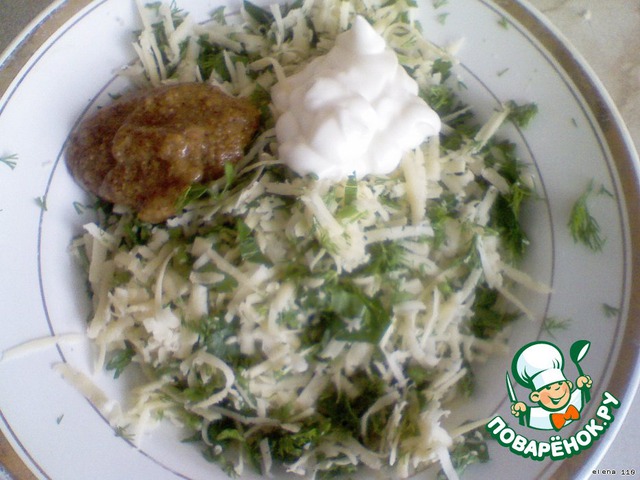 Смешать натертый на тeрке сыр (75 г), майонез, мелко порезанную зелень (1 /3 части от подготовленной), горчицу, приправу, грецкие орехи.