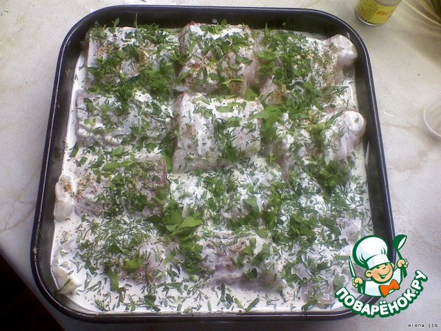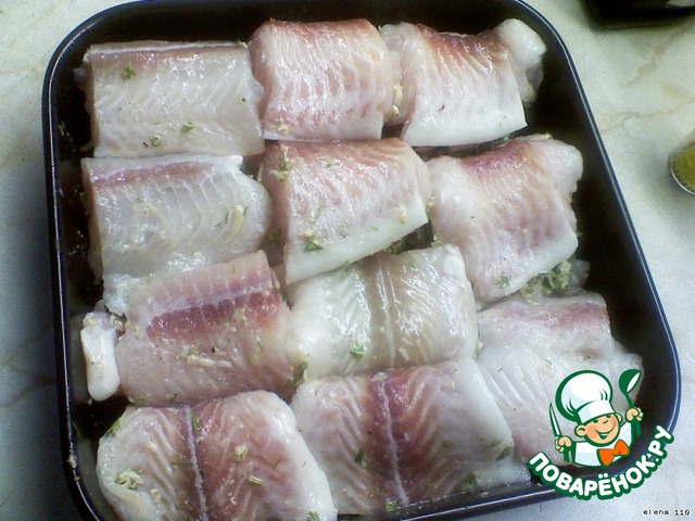 Каждый кусочек рыбы сложить пополам и положить в форму для запекания.