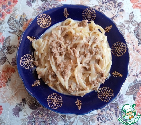 Отвариваем в солёной воде макароны, желательно из твёрдых сортов пшеницы. В сковороде на оливковом или растительном масле обжариваем порезанный лук, добавляем консервы (масло можно слить), когда всё немного подрумянится добавить сметану, соль, перец, укроп и немного потушить. В готовый соус в сковородку высыпать макароны и помешивая подержать на огне ещё пару минут. Наше, очень быстрое в приготовлении, блюдо готово.