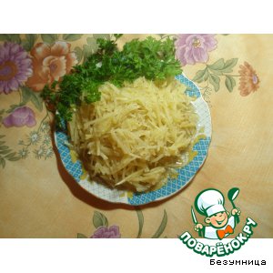 Оригинальный салатик из картофеля. Хотя меня терзают смутные сомнения, что он принадлежит к корейской кухне. Рецепт из маминой книжки, а откуда - она не помнит.