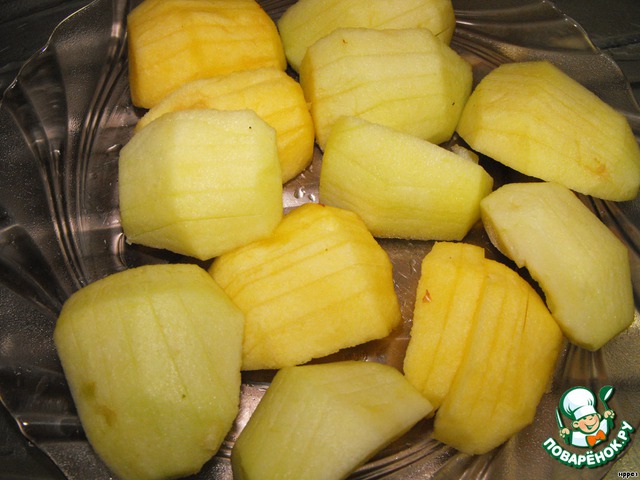 Яблоки почистить, разрезать на 4 части, вырезать серединку.