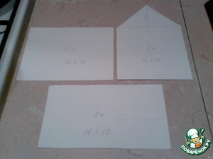 Теперь сделаем шаблоны из бумаги, их будет 3 штучки: крыша 10*18; бока 12*16; торец вместе с фронтоном: торец 12*12, фронтон: высота треугольника - 6 см (на фото - деталь с треуг. крышей).