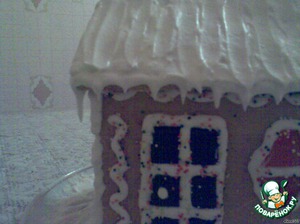 Теперь смажем верхние края и приделываем крышу, покрываем её белковой массой, приделываем трубу, из кусочка коржа, свешиваем сосульки и т.д.