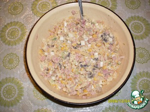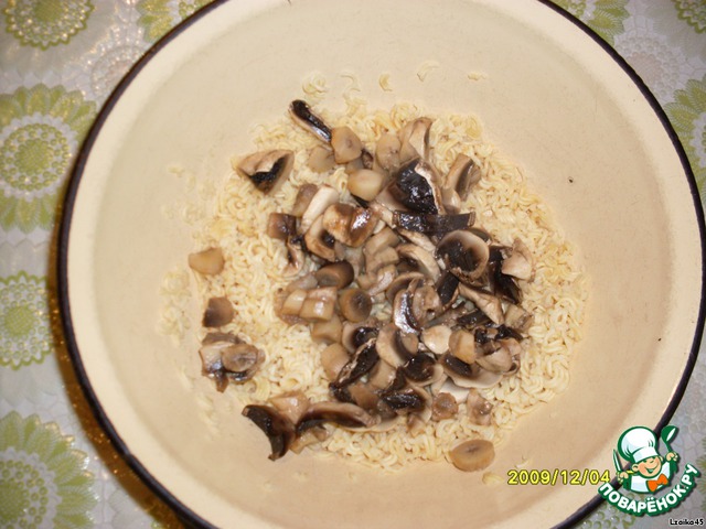 "Мивину" измельчить и залить кипятком (совсем немного, чтобы чуть-чуть покрыло). Остудить. Проследить, чтобы не осталось жидкости. Пусть лучше вермишель будет слегка твердоватая...