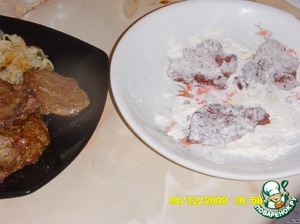 На другую тарелку насыпать муку, обмакнуть в ней с 2-х сторон печень. -