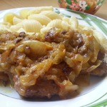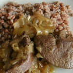 Теперь в свовородку (в кастрюлю, если много нажарили печени) складываем слоями лук и печенку. Если надо, можно еще 1-2 ст. л. масла добавить.