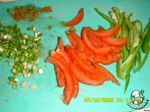 Нарезать полосками перец и помидор без мякоти, лук зеленый.