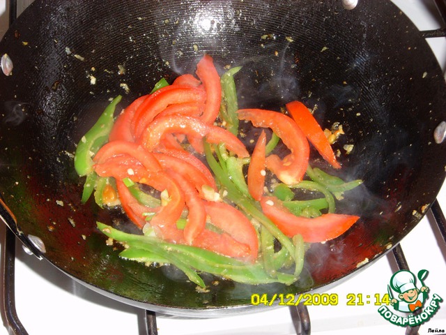 Сначала обжарить перец - 2-3 мин, затем помидор и лук.