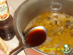 Долить воду, соевый соус и добавить куркуму.