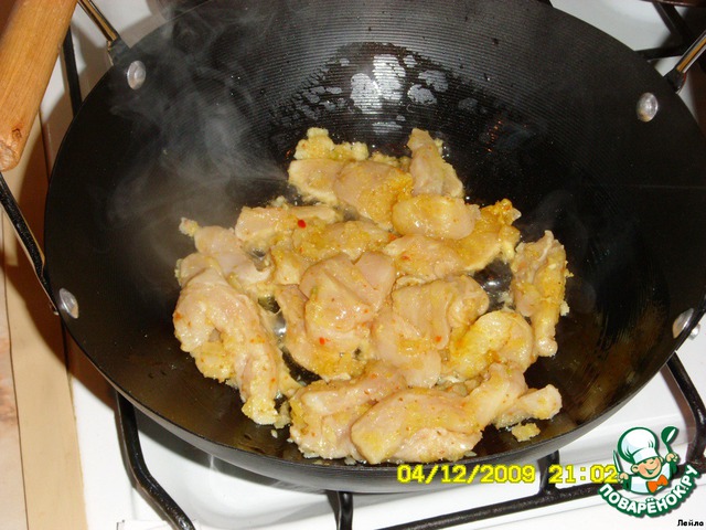 В вок налить растительное масло (+ добавила кунжутное), на среднем огне обжарить филе. Отложить пока в другую посуду.