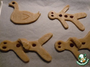 Готовое тесто раскатать толщиной 0,5 см. С помощью шаблона вырезать человечков и гусей.