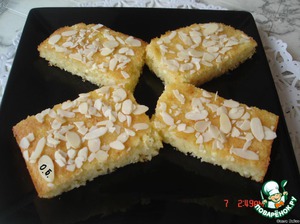 Готовую запеканку полить сиропом, присыпать миндалем и порезать на кусочки.
