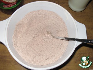 1 стакан сахара, 2 столовые ложки какао, 2 стакана муки - все перемешать.