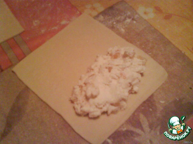 Разморозить слоеное тесто, раскатать его в одном направлении до толщины в 2 мм. Разрезать на квадраты (у меня получилось 8 квадратиков).