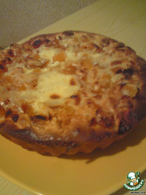 На все тесто выкладываю теплую начинку, наливаю на бортики получившийся сахарный сиропчик и заливаю курагу сметаной, смешанной с сахарной пудрой.