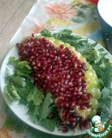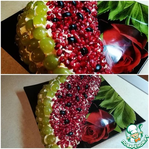 Идея оформления этого салатика появилась давно, благодаря одноименному тортику с нашего сайта. Спасибо Леночке за вдохновение! Готовила доче на ДР. Гостям и мне "долька" пришлась по вкусу. Уверена, что и Вам понравится ))).