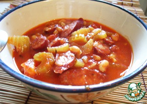 Охотничьи колбаски нарезаем. Вообще в рецепте была чоризо... Но... Не сказать, конечно, чтобы в средней полосе России нельзя было ее найти, просто стоимость ее... Короче, жаба душит из нее суп варить, поэтому охотничьи колбаски - они тоже вкусные, перчика побольше добавим (да простят мне перуанцы мою вольность :-[ ). Но если у вас в холодильнике залежался кусок чоризо и ждет своего часа - то в дело его, в дело! Так, заболталась я что-то :-D - колбаски нарезанные отправляем к луку и чесноку.