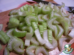 Сельдерей нарезаем кусочками и тоже закидываем в кастрюлю, не забываем перемешать.