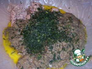 Далее выкладываем к рыбе, перемешиваем, солим, перчим, кладём зелень, манку и крахмал, всё хорошо перемешать.