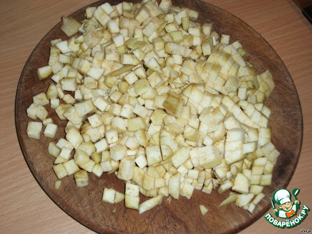 Баклажаны режем кубиками. Можно пластинками - так красивее, но вкус слегка ухудшается.