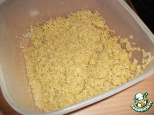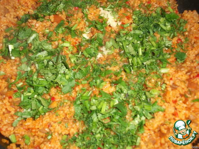 ... выкладываем в сковородку крупу и быстро обжариваем на масле. Даже, скорее, не обжариваем, а обвалакиваем остальными компонентами.