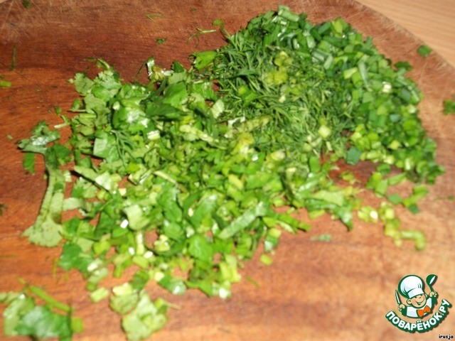 Мелко нарезаем любимую зелень. На мой взгляд лучше всего сюда идет кинза, укроп и шнит-лук.