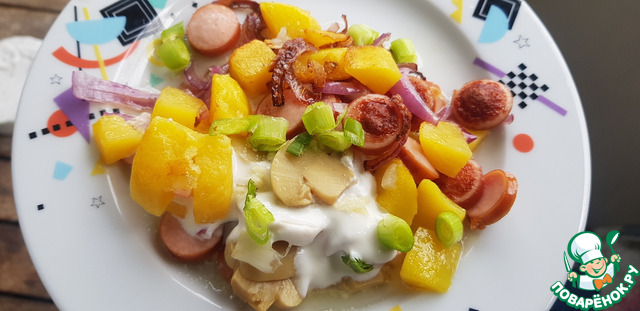 Лук + морковь режем и обжариваем. Сосиски режем кубиками и обжариваем, перчим. Грибочки тоже обжарить. Заполняем горшочки: лук с морковью, картофель, помидор, фасоль и грибочки.