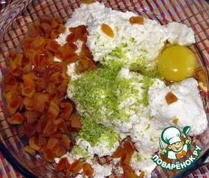 Творог протираем через сито или разминаем вилкой, добавляем измельченную курагу, цедру лимона, соль, сахар, 1 яйцо, манную крупу, сливки или молоко.