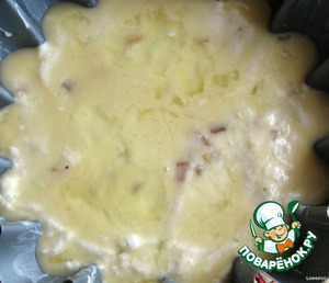 Выкладываем в форму, смазанную сливочным маслом, разравниваем и заливаем взбитым яйцом или яичной массой, смешанной с молоком или сметаной. Выпекаем в духовом шкафу около 30 минут.