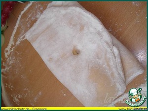Рабочую поверхность посыпать мукой и раскатать тесто в прямоугольник. Начинайте с середины и в стороны…