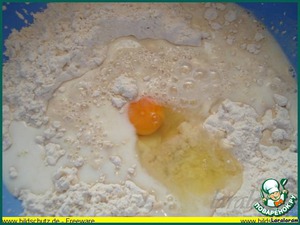 Воду, яйцо и молоко добавить и вымешать в течении 3-4 мин.