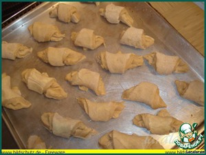 Разложить их на противень, затем засовываем в мешок и ставим в тёплое место - только не поймите это буквально (НИКАКИХ источников тепла!), в данном случае тёплое место - это просто "нехолодильник". В противном случае масло потечёт, и будут у вас не круассаны, а … вобщем, некруассаны… Оставляем на 2 часа.