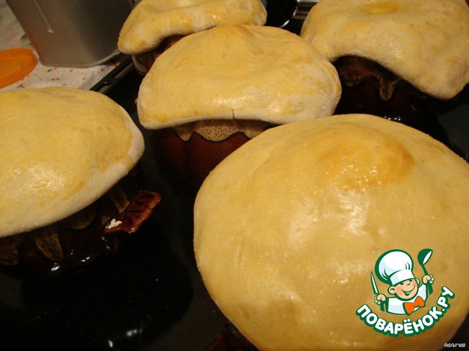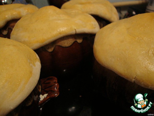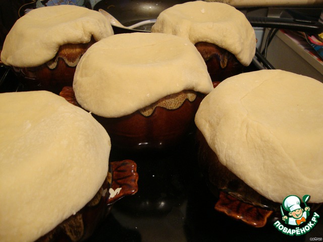 Из теста раскатываем лепешки-крышечки и аккуратно накрываем ими наши горшочки.