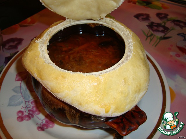 Немного нетрадиционное приготовление щей из свежей капусты в старинной "купеческой " манере. Ароматные, наваристые щи, да в горшочке под румяной хлебной крышечкой - так уютно...