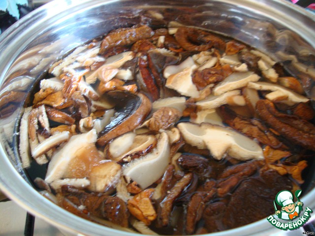 Сушеные грибы (у меня была упаковочка смеси белых, подосиновиков и лисичек) промыть, замочить в холодной воде часа на 2, смотрите по грибам, до размягчения. Поставить их варить в этой же воде. Варить грибы следует не меньше часа.