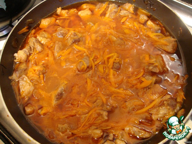 Когда мясо зарумянится, добавляем к нему морковку, потом лук.