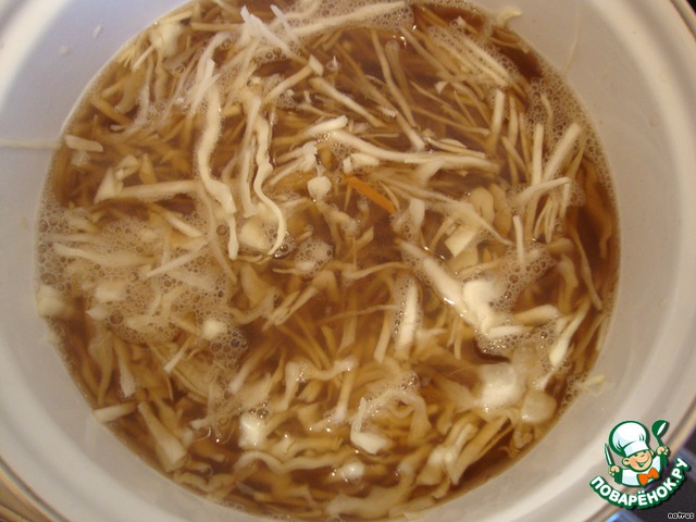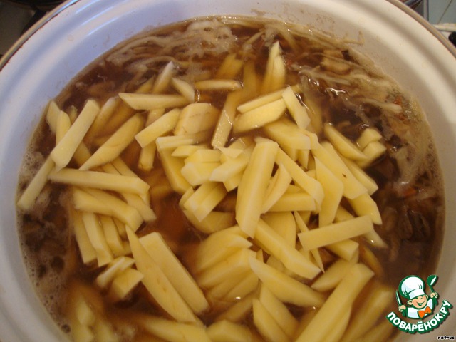 Когда грибы будут готовы, откидываем их на дуршлаг, бульон, если необходимо, процеживаем (грибы все-таки бывают разные. В этот раз у меня были покупные и на удивление чистейшие!). Варим все в трехлитровой кастрюле. В бульон кладем нашу капустку.