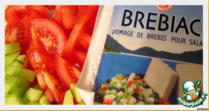 Нарежем помидоры. Очистим огурец от кожицы и удалим семечки, чтобы салат не был водянистым. Порежем огурец небольшими дольками. Брынзу раскрошим на кусочки.