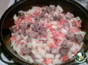 Мясо, морковь и лук порезать, разогреть в глубокой сковороде растительное масло и обжарить до полу-готовности.