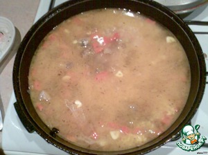Затем мясо с овощами солим, перчим, добавляем специи, курагу и чеснок, перемешиваем, сверху выкладываем промытый и подсушенный рис, заливаем кипячёной водой так, чтобы покрывала рис примерно на 1,5 см.